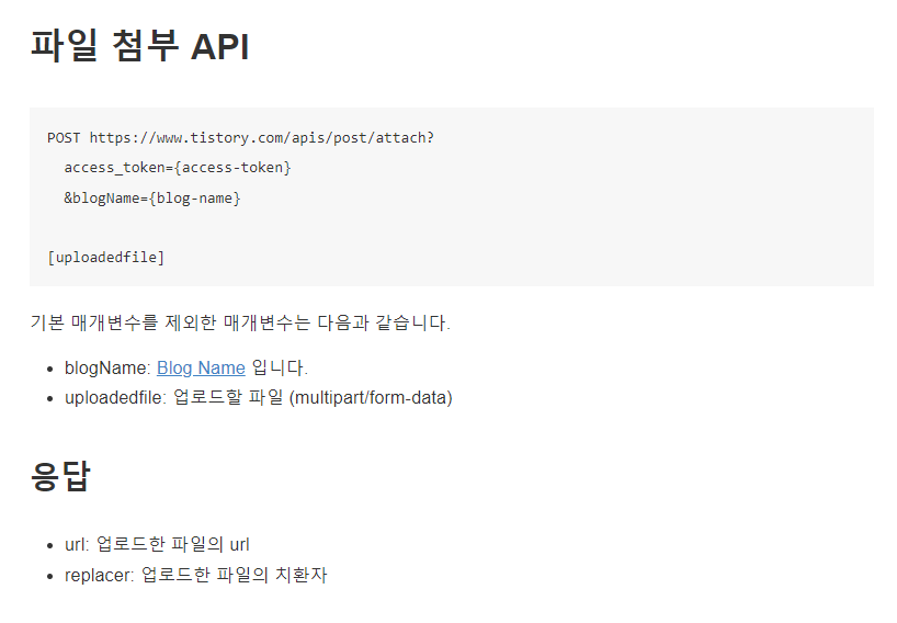 글만 쓸수는 없습니다. 사진도 낭낭하게 담아야 합니다. 문서를 봅니다. 기본변수인 access_token과 output은 여기도 사용되어야 합니다. 추가적으로 blogName과 업로드할 파일경로를 담아야 합니다.